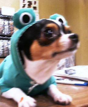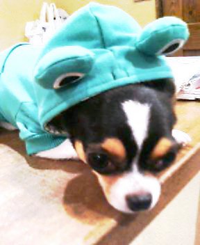 近くの∪(^⊥^)∪shopの看板娘チワワのルチャちゃんです♪ 今日はカエルになってお出迎え~☆ ルチャちゃんのママは、このshopの 店長さんです(*^_^*) ∪(^⊥^)∪shopは…トリミング、ホテルの他、可愛い服やグッズ、おやつなどがいっぱい揃ってる とってもお洒落なお店です!! コロちんはひげと爪切りでお世話になってま~す♪