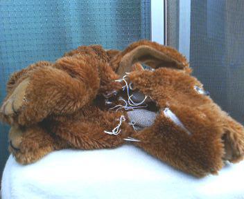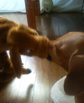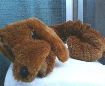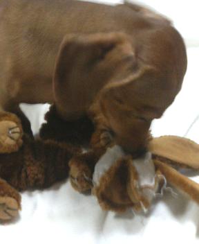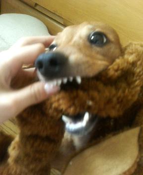 今日の戦いは? ぱく;「今日は負けないぞぉ~」 コロ;「ガルゥゥ」 ぱく;「アッアウエエ~」 ←(たったすけて~) コロ;「ガル、ガルゥ」 ぱく;「ギブ!ギブ!」 コロ;「きょうもぼくの勝利」 ぱくちゃんの痛々しい姿… おもちゃはすぐにボロボロです… 中の綿を出しちゃうので、くにゃくにゃ状態