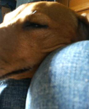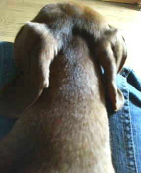 「ちょっと休憩」 私が座ると、こんな感じで乗ってきます。 ここがコロの指定席 前から見たら、こんな顔 「ねぇコロさん… お尻がしびれてきちゃったから、 そろそろ降りてちょうだいよぉ」